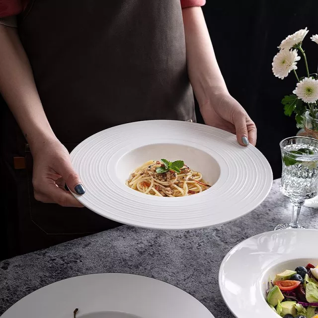 This premium ceramic plate is made with high-quality materials and finished in pure white for a timeless aesthetic that suits any table setting. Its wide, gently curved rim and deep center make it ideal for holding pasta, salads, soups, risottos, noodles, and more. With an approximate width of 9–10 inches, it offers ample space for generous portions while keeping your presentation neat and refined.