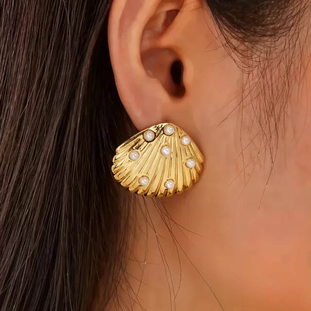 These earrings are made with high-quality stainless steel, known for its strength and long-lasting shine. Their geometric shell design paired with smooth faux pearls creates a balanced, stylish look. With a comfortable push-back closure, they stay securely in place all day. Each stud measures just the right size to stand out without feeling heavy—perfect for daily wear or travel.